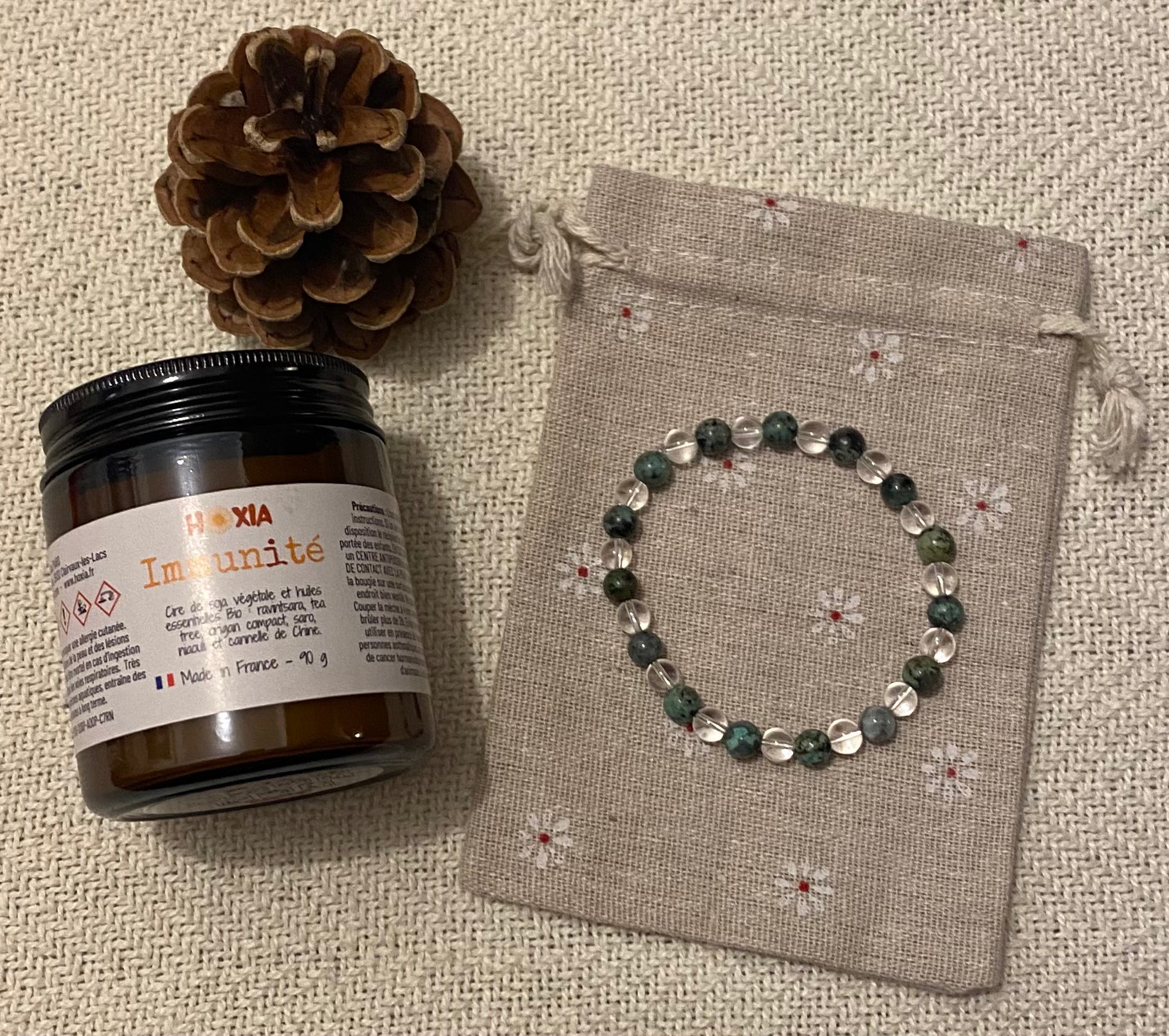 Bougie à la cire de soja végétale et aux huiles essentielles Bio avec son bracelet en pierres naturelles, Made in Jura !