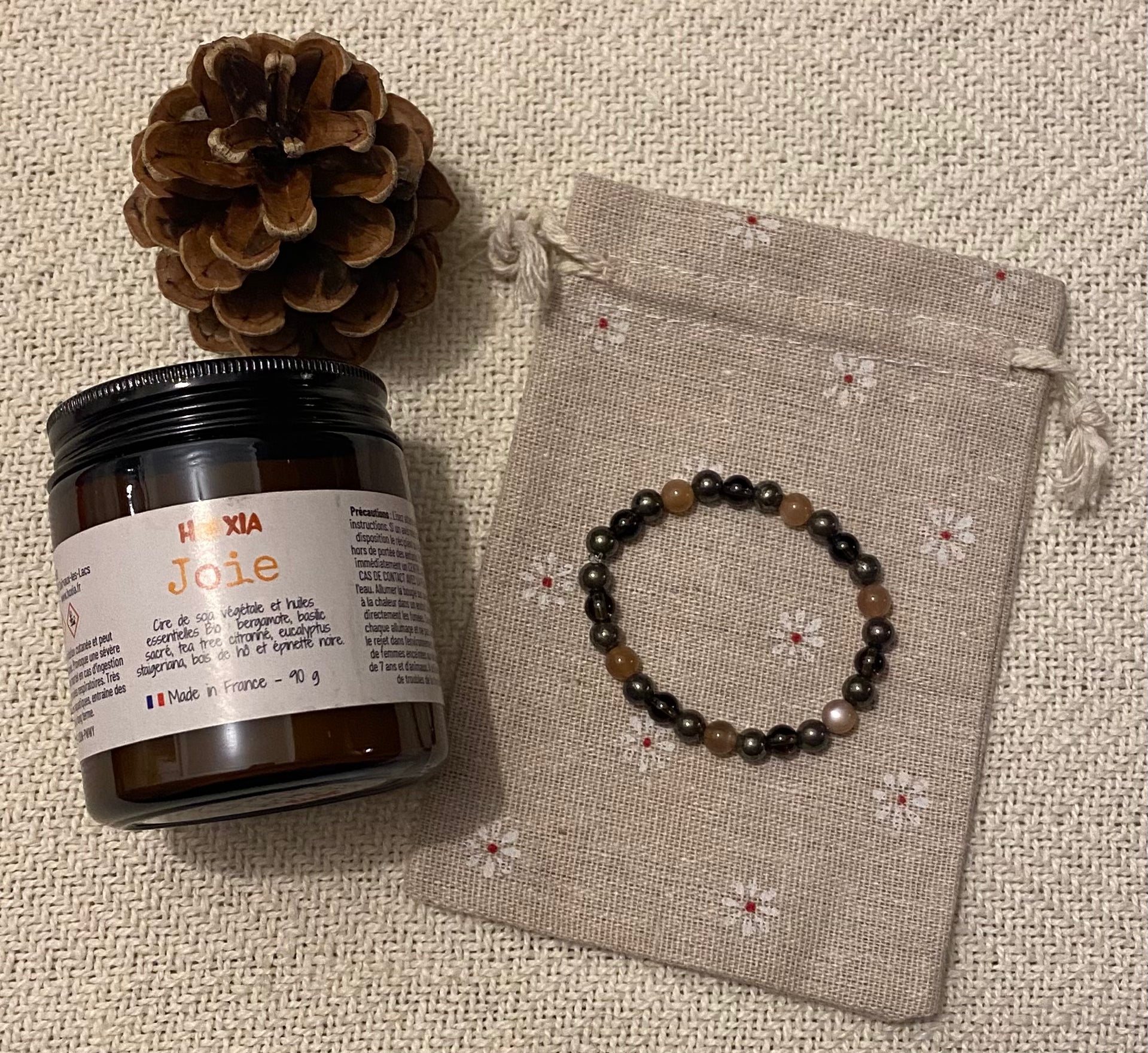 Bougie à la cire de soja végétale et aux huiles essentielles Bio avec son bracelet en pierres naturelles, Made in Jura !